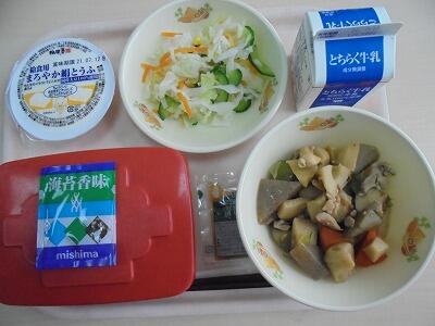今日の給食の献立は、【ごはん(ふりかけ)・牛乳・筑前煮・豆腐サラダ】でした。