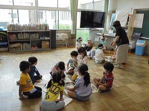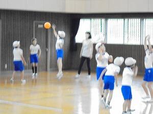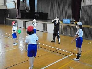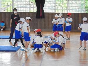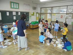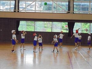 風船を使って、風船を床に落とさないように(グループごとに回数を数えながら)打ち合っていました。