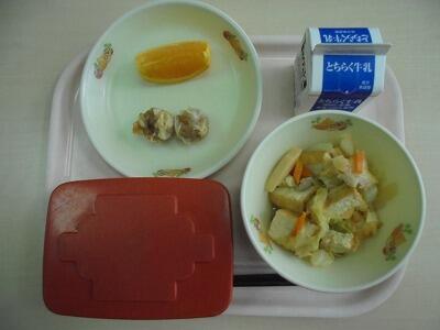 今日の給食の献立は、【ごはん・牛乳・ジャージャン豆腐・ポークシュウマイ・オレンジ】でした。