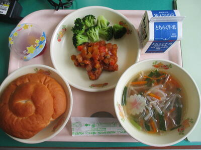 今日の給食の献立は、【バターロール・ほしのハンバーグカラフルソースかけ・ブロッコリー・たなば