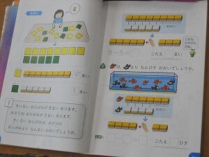 電子黒板や具体物を使いながら、「引き算」の学習をしています。