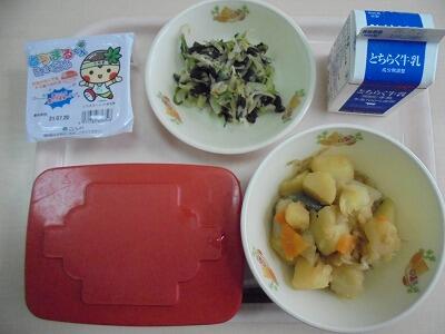 今日の給食の献立は、【ごはん・牛乳・冷ややっこ・ピリ辛肉じゃが・のり和え】でした。