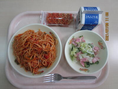 今日の給食の献立は、【なつやさいスパゲティ・ハムマリネサラダ・チーズドック】でした。