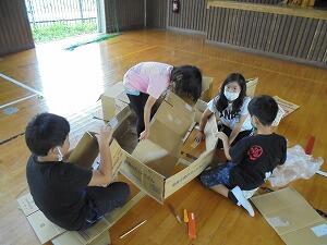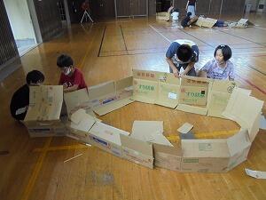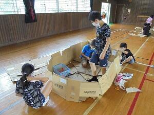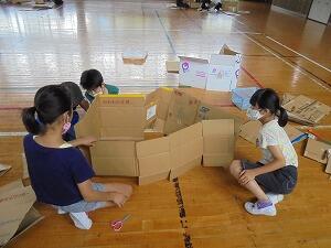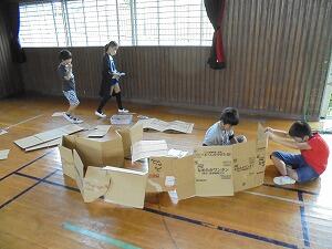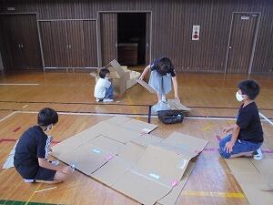 図工の時間。段ボールを使って、グループごとに和気あいあいと創作活動をしていました。