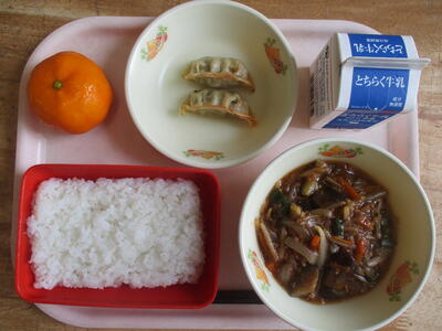 今日の給食の献立は、【ごはん・牛乳・マーボーなす・ぎょうざ・冷凍みかん】でした。