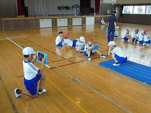 2時間目。2年生の体育「マット運動」では、友達の演技をタブレットで撮影して互いに見せ合い、技が滑らかにできるようにと(タブレットを)活用していました。