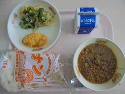 今日の給食の献立は、【ナン・牛乳・キーマカレー・オムレツ・イタリアンサラダ】でした。