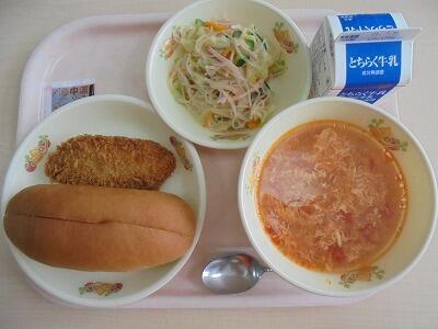 今日の給食の献立は、【コッペパン・牛乳・白身魚フライ・春雨サラダ・トマトスープ】でした。