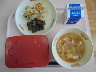 今日の給食の献立は、【ごはん・牛乳・鶏肉のニラソースかけ・ナムル・かんぴょうの味噌汁】でした。