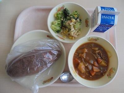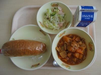 今日の給食の献立は、【揚げパン・牛乳・ブラウンシチュー・花野菜のサラダ】でした。