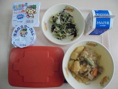 今日の給食の献立は、【ごはん・牛乳・冷奴・ピリ辛肉じゃが・のり和え・ヨーグルト】でした。