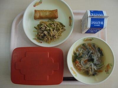今日の給食の献立は、【ごはん・牛乳・チンジャオロース・春巻き・春雨スープ】でした。