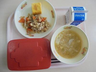 今日の給食の献立は、【ごはん・牛乳・とり飯の具・ベリーちゃんのたまご焼き・あまべじる】でした。