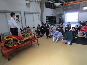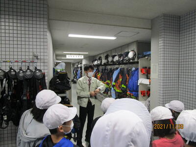 鹿沼消防署では、社会の教科書で学習した緊急司令室の様子を見たり、消防車や救急車、消防服など実