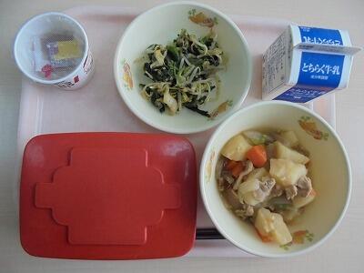 今日の給食の献立は、【ごはん・牛乳・納豆・肉じゃが・ほうれん草と白菜のおかか和え】でした。