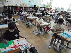 1年生の図工の時間は、絵の具を使った描く活動。