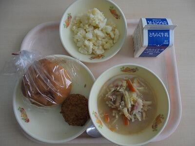 今日の給食の献立は、【丸パン・牛乳・メンチカツ・チーズポテト・チャンポンスープ】でした。