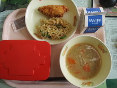 今日の給食の献立は、【ごはん・あじフライ・きりぼしだいこんサラダ・こんさいのごまじる】でした。