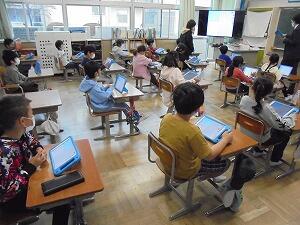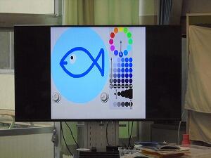 2年生教室では、ビスケットというソフトを活用して、「自分が描いた魚を動かす」というプログラミングを学習していました。