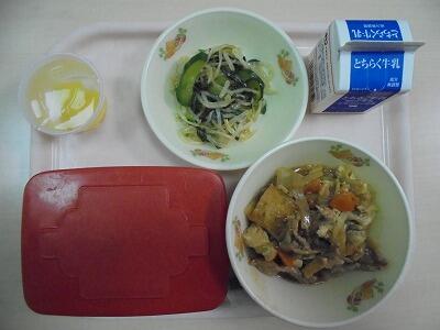 今日の給食の献立は、【ごはん・牛乳・ジャージャン豆腐・ナムル・手作りゼリー】でした。