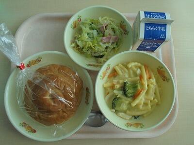 今日の給食の献立は、【バターロール・牛乳・マカロニのクリーム煮・ハムマリネサラダ】でした。