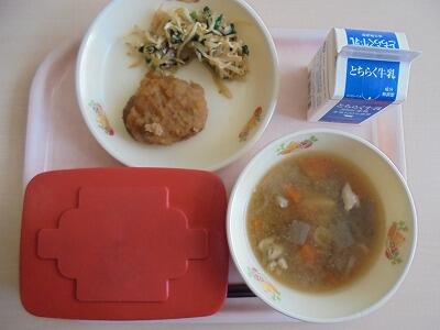 今日の給食の献立は、【ごはん・牛乳・ハンバーグおろしソースかけ・おひたし・とりごぼう汁】でした。
