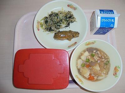 今日の給食の献立は、【ごはん・牛乳・いわしごま味噌煮・のり和え・里芋のそぼろ煮】でした。