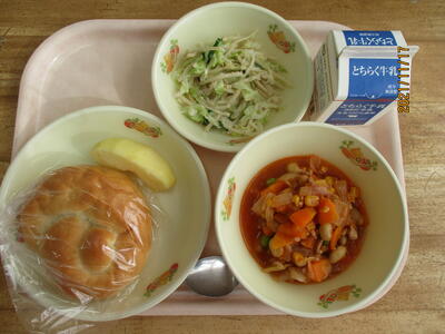 今日の給食は、【こめこパン・牛乳・ポークビーンズ・ごぼうサラダ・りんご】でした。