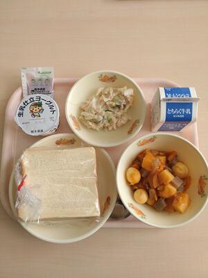 今日の給食の献立は、【黒パン・牛乳・さつまいものシチュー・ツナサラダ】でした。