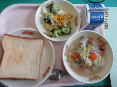 今日の給食の献立は、【メープルトースト・牛乳・ポトフ・はなやさいサラダ】でした。
