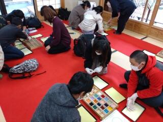円通寺で数珠作りに挑戦です。作り方の説明を聞いた後、自分のサイズに合わせて色を選んで数珠を作っています。