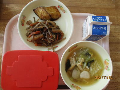今日の給食の献立は、【ごはん・牛乳・サバのカレーしょうゆやき・ごもくきんぴら・みそしる】でし