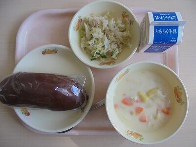今日の給食の献立は、【黒パン・牛乳・さつまいものシチュー・ツナサラダ】でした。