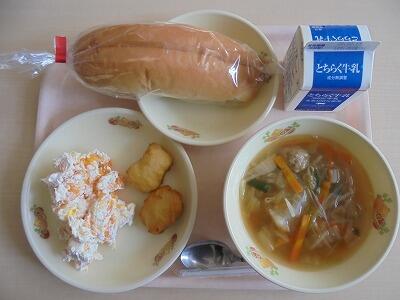 今日の給食の献立は、【ドックパン・牛乳・フルーツクリーム・チキンナゲット・肉団子スープ】でした。
