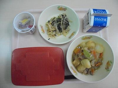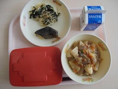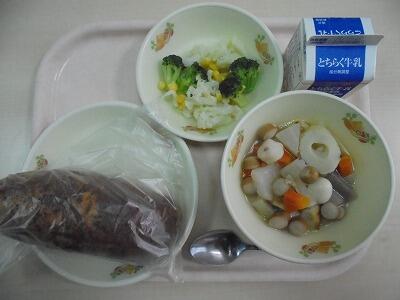 今日の給食の献立は、【ごはん・牛乳・厚焼き玉子・五目煮・どさん子汁】でした。