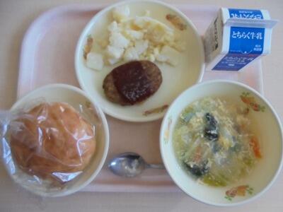 今日の給食の献立は、【丸パン・牛乳・ハンバーグケチャップかけ・チーズポテト・玉子スープ】でした。