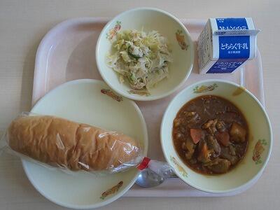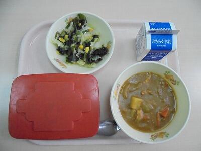 今日の給食の献立は、【大麦ごはん・牛乳・チキンカレー・海藻サラダ】でした。