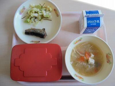 今日の給食の献立は、【ごはん・牛乳・いわしのおかか煮・キャベツの塩昆布漬け・豚汁】でした。