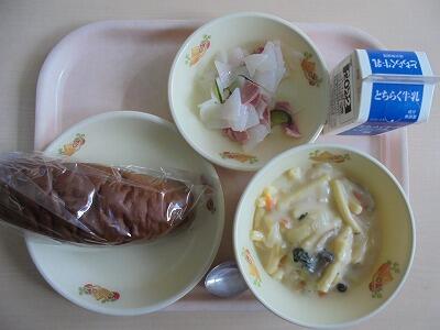 今日の給食の献立は、【黒パン・牛乳・マカロニのクリーム煮・ハムと大根のマリネ】でした。