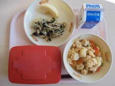今日の給食の献立は、【ごはん・牛乳・親子煮・のり和え・りんご】でした。