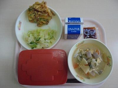 今日の給食の献立は、【ごはん・牛乳・かきあげ・即席漬け・豆乳入り味噌汁】でした。