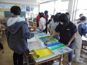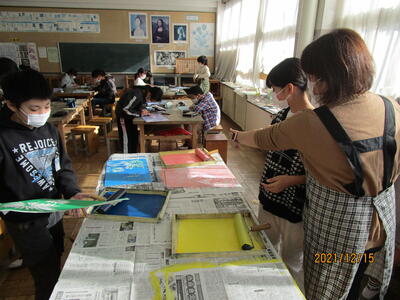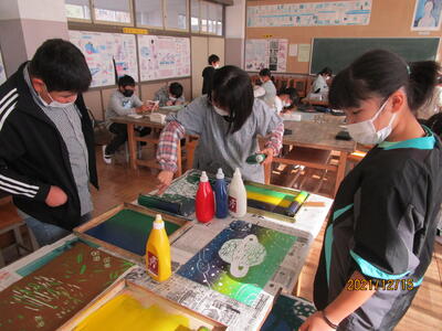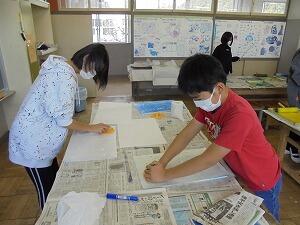 3、4時間目は図工の時間。木版画を掘り進め、刷る段階に入りました。