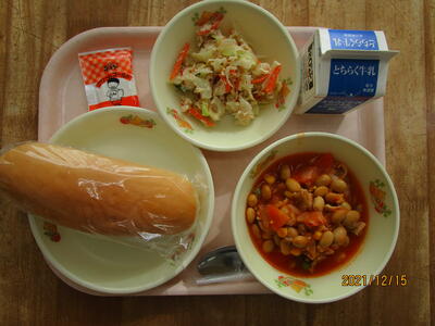 今日の給食の献立は、【コッペパン・クリームゴールド・牛乳・ポークビーンズ・チキンサラダ】でし