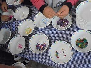 1年生が、図工の時間にクリスマスツリーを制作していました。