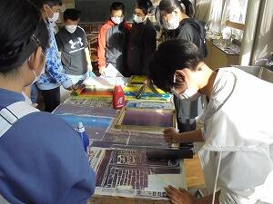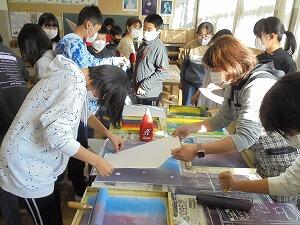 木版画の学習です。完成した時の白黒の配置を考えながら、彫刻刀を使って慎重に彫りの作業を進めていました。