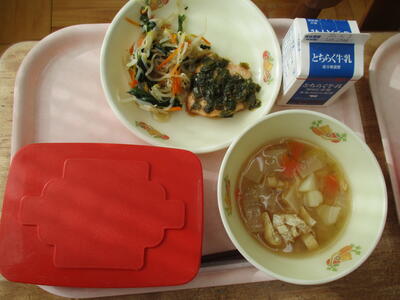 今日の給食の献立は、【バターロール・牛乳・チキンのオーブン焼き・ブロッコリーサラダ・ミネストローネ・ケーキ】でした。