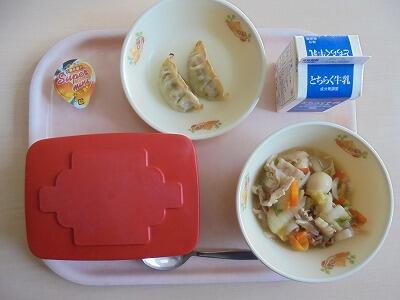 今日の給食の献立は、【ごはん・牛乳・中華丼の具・餃子・オレンジゼリー】でした。