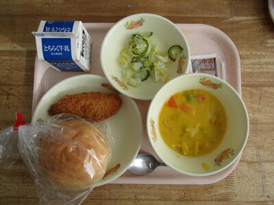 今日の給食の献立は、とうじこんだて【まるパン・牛乳・しろみさかなフライ・ゆずいりはくさいサラ