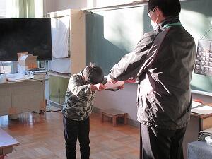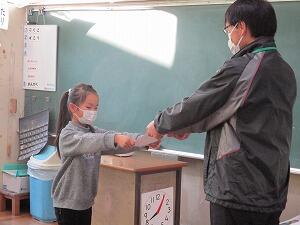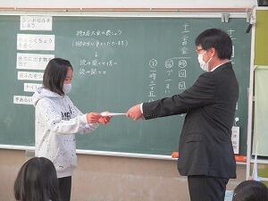 全体で集まることをせずに、学校長が各教室に出向いて、1年生から3年生までの男女各1位~3位の成績を収めた児童(18名)に表彰状を手渡しました。