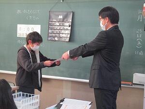 先日と同じように、朝の読書の時間を活用して各教室にて賞状を手渡しました。